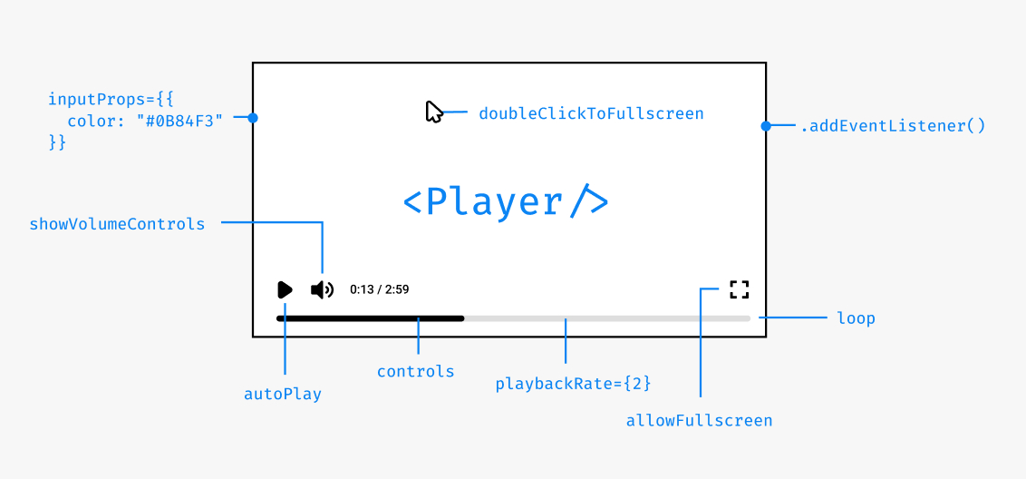 A player now has a volume slider, and a mute button to allow the user to control the video. You can decide whether you want to display these controls using the showVolumeControls prop.